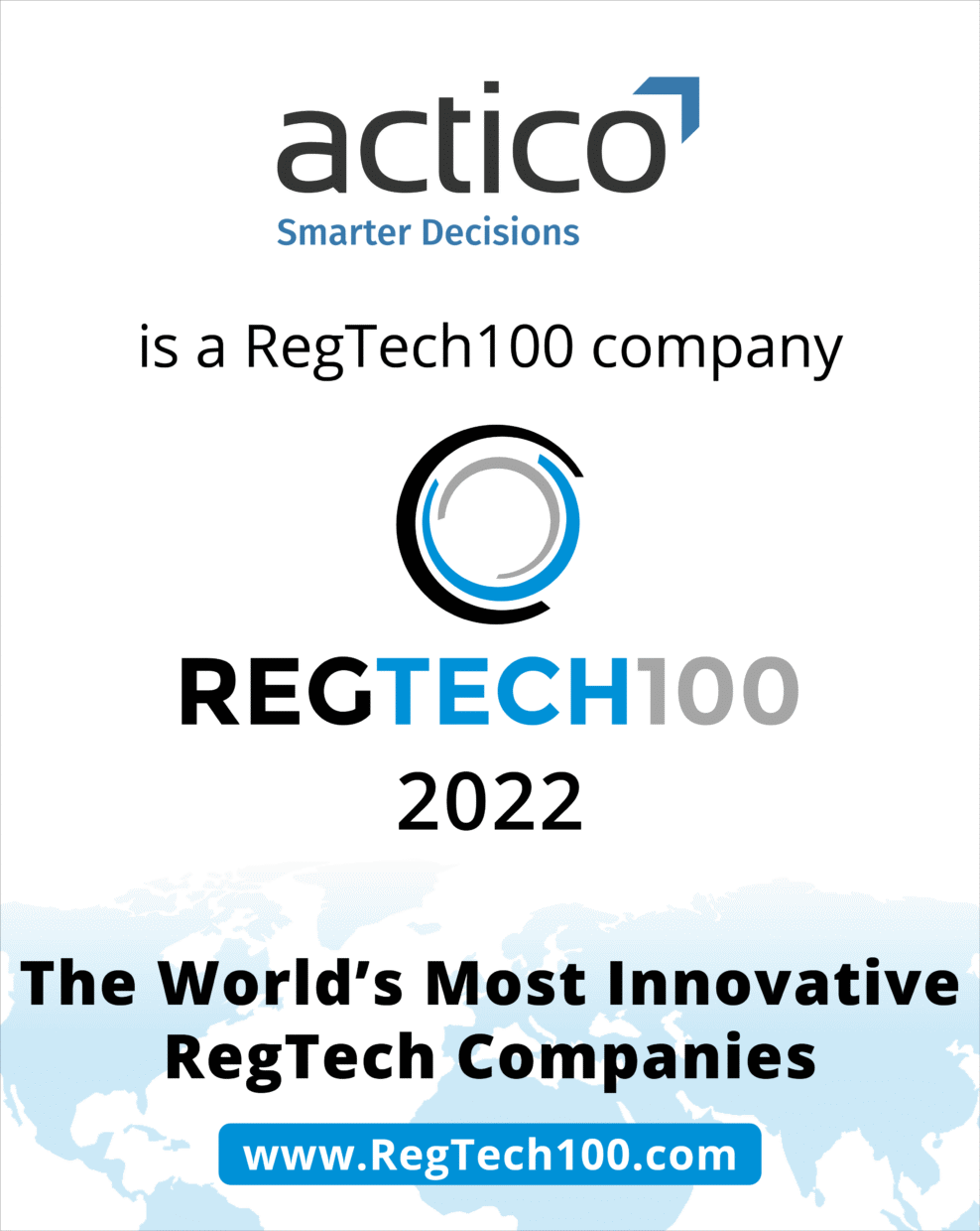 London / Immenstaad, December 07, 2021 – Specialist research firm RegTech Analyst today released the annual RegTech100 list for 2022. The list displays the world’s most innovative tech solution providers that address the challenges of regulatory pressures within financial services. Once again ACTICO ranks among the top 100 RegTech companies worldwide. A panel of analysts and industry experts voted from a longlist of nearly 1,200 companies.